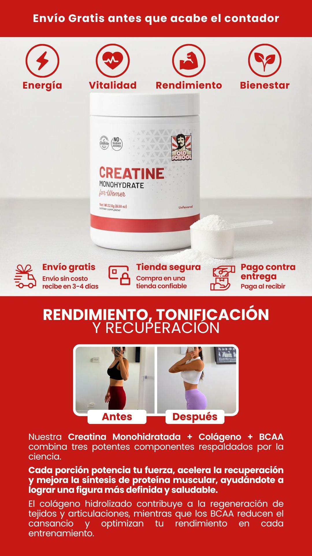 Esta fórmula está diseñada especialmente para mujeres, combinando creatina pura con colágeno y BCAA para mejorar el rendimiento, la tonificación y el cuidado articular.