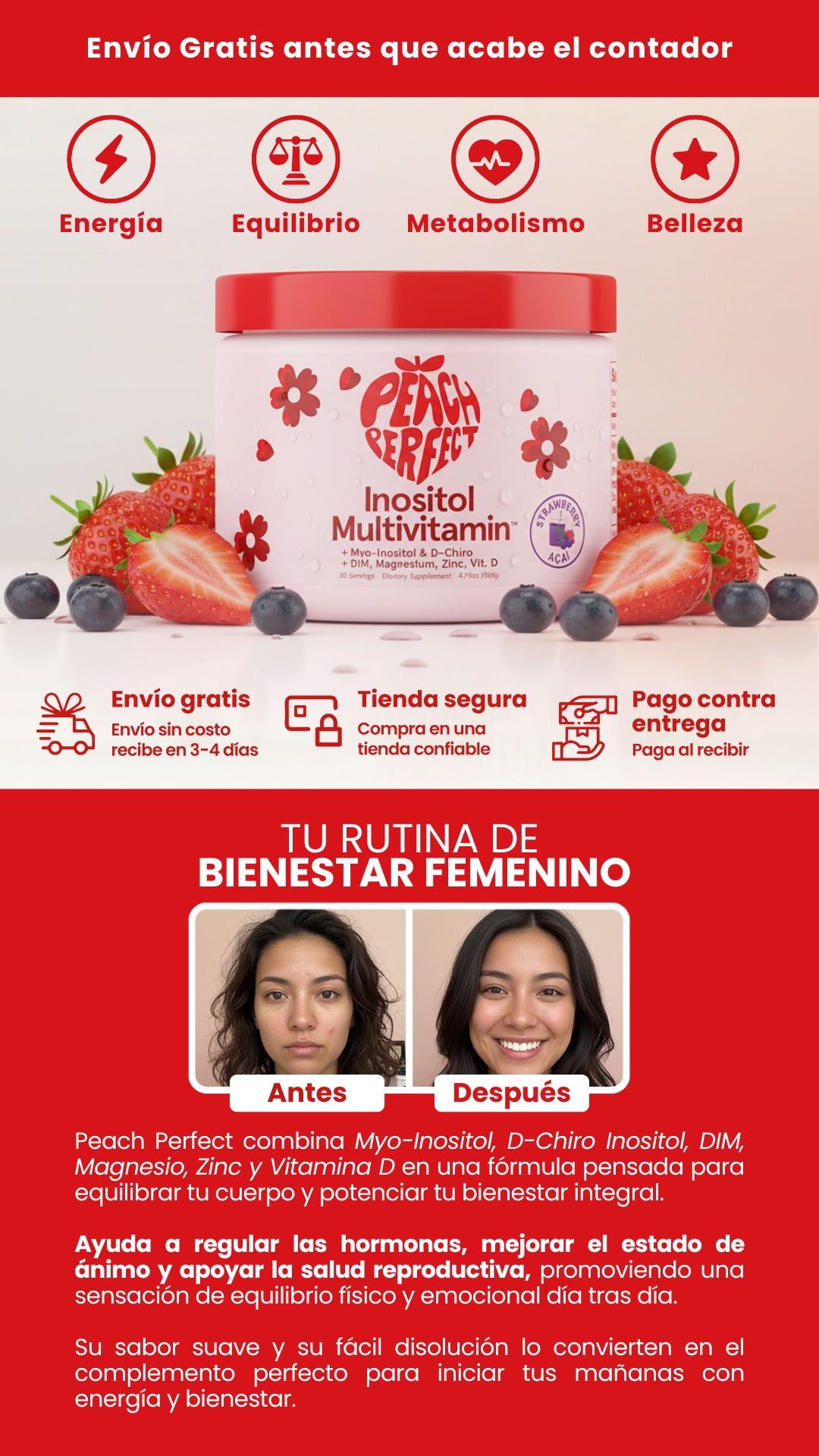 El tiempo de entrega es de 2 a 5 días (en algunos casos específicos más, dependiendo de la ubicación), y el pago es contra entrega, lo que significa que solo pagas cuando recibes el producto.